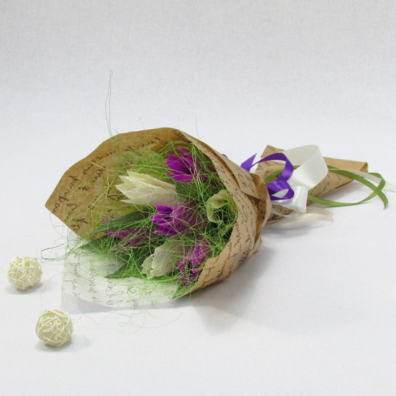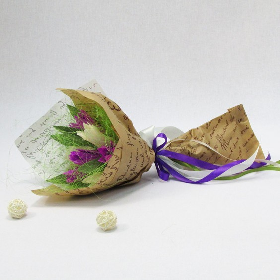 Виконаний з симпатичних тюльпанчиков-цукерок. Всередині кожного тюльпанчика можна знайти шоколадну цукерку. Тюльпанчики в букеті зроблені в спокійних білих і бузкових тонах. Зовні композиція декорована модним крафтовим папером. Ручка букета прикрашена красивими атласними стрічками.